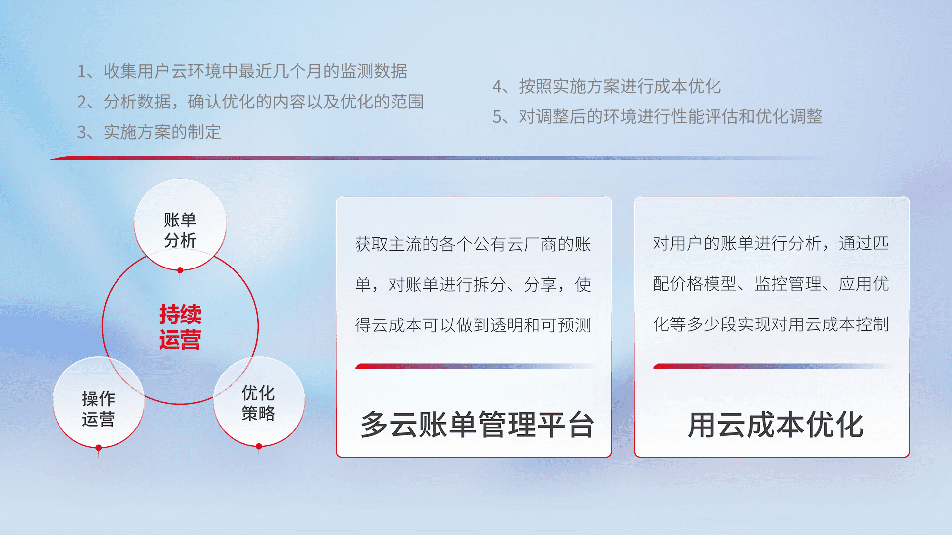 通过多云纳管,,,,以统一的资源数据模型把客户的云资源进行抽象和封装,,,,进而实现对多云资源的统一操作,,,保障云资源管理的可靠性、、、、稳定性与可用性。。量身定制化运维内容,,,,配置、、、开发运维、、补丁管理、、、备份、、监控、、、认证和访问管理、、审计和日常巡检等,,,保障在用云过程中的可靠度,,,稳定度以及高可用率。。